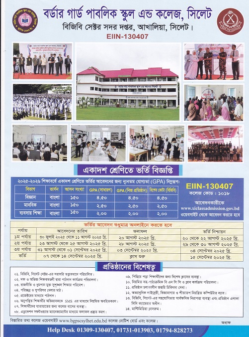একাদশ ভর্তি সংক্রান্ত যে কোন যোগাযোগ : 01309130407, 01731013903, 01794828273 *** প্রতিষ্ঠান বন্ধের বিজ্ঞপ্তি *** ''জাতীয় বিজ্ঞান বিতর্ক উৎসব ২০২৫'' এ অপরাজেয় চেম্পিয়ন হওয়ার গৌরব অর্জন *** বর্ডার গার্ড পাবলিক স্কুল এন্ড কলেজ, সিলেট এর স্কুল শাখার অভিভাবক সমাবেশ *** বর্ডার গার্ড পাবলিক স্কুল এন্ড কলেজ, সিলেট এর গর্ভনিং বডির চেয়ারম্যান ও সেক্টর কমান্ডার বিজিবি সিলেট ব্রিগেডিয়ার জেনারেল মোহাম্মদ সাইফুল ইসলাম চৌধুরী বিজিবিএম মহোদয়ের বিদায় সংবর্ধনা *** নিয়োগ বিজ্ঞপ্তি *** যথাযোগ্য মর্যাদায় পবিত্র ঈদ-ই-মিলাদুন্নবী (সা.)  উদযাপন *** একাদশ শ্রেণিতে ভর্তিচ্ছু শিক্ষার্থীদের জন্য জরুরী নিদর্শনা *** দশম শ্রেণির প্রাক-নির্বাচনি পরিক্ষার সময়সূচী *** ভর্তি বিজ্ঞপ্তি ***
